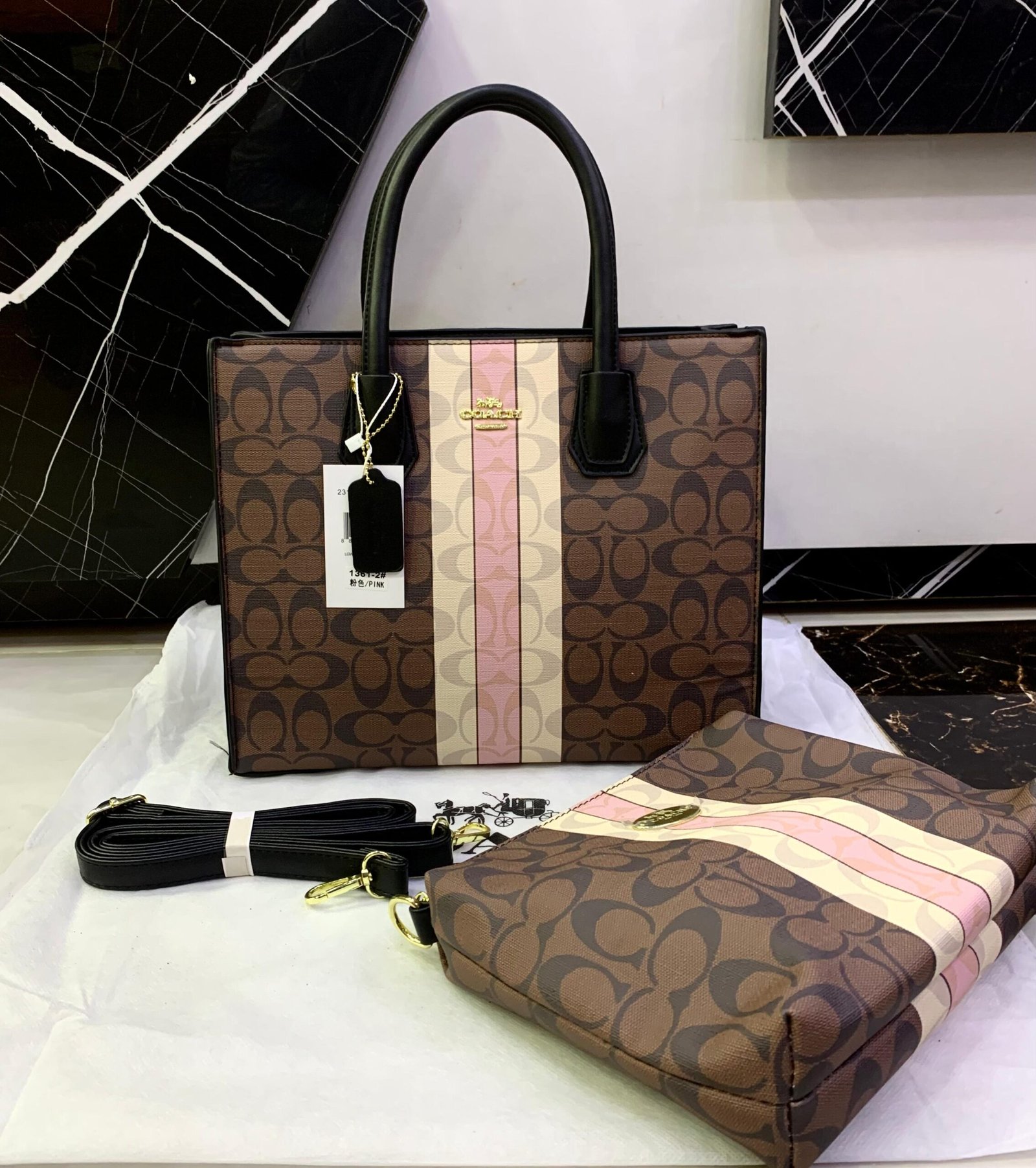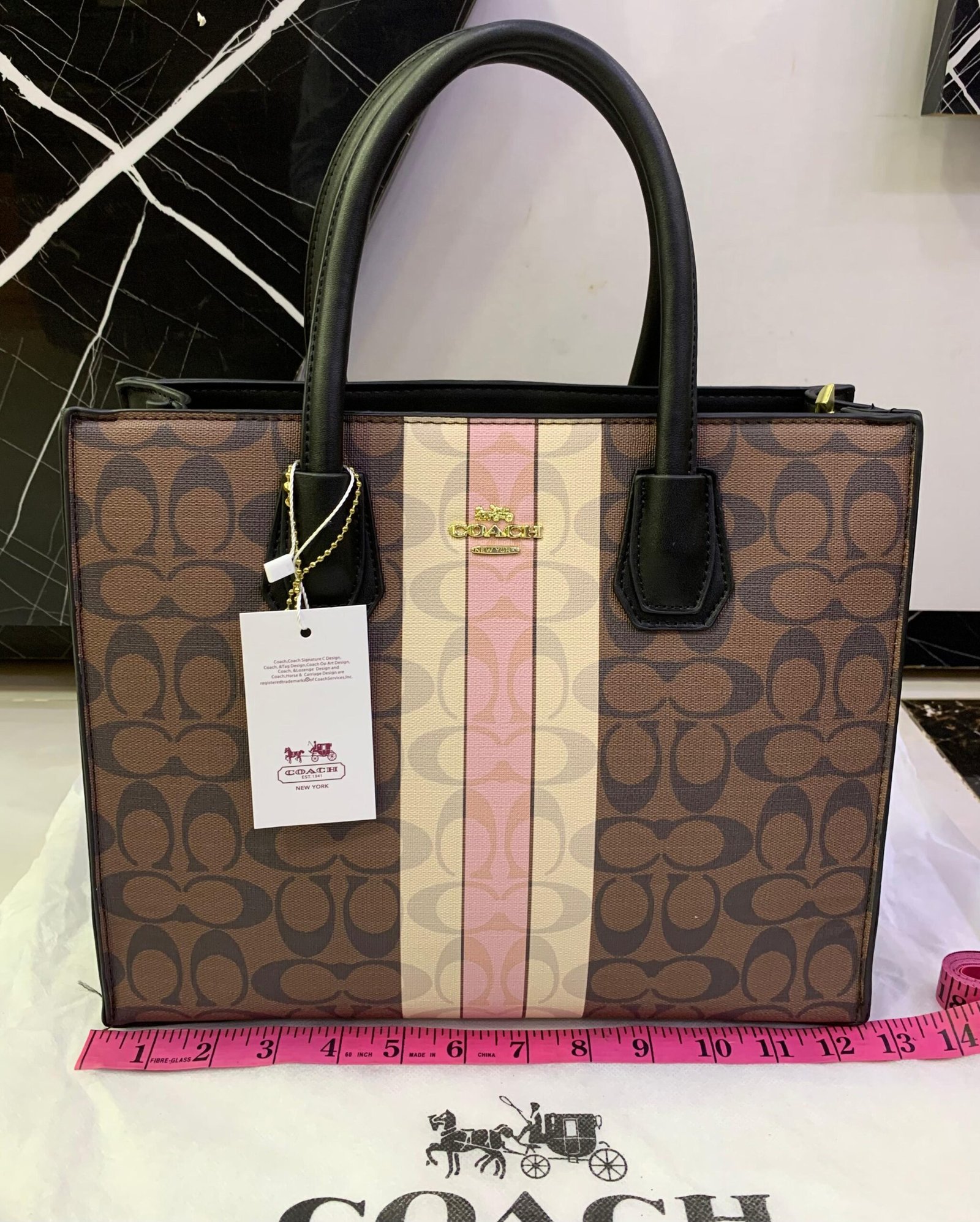 Elevate your everyday style with the Coach Signature Stripe Tote, a perfect blend of modern elegance and timeless design. Crafted from high-quality coated canvas with the iconic Coach “C” monogram, this bag is accented by a beautiful triple stripe panel in beige and soft pink tones, giving it a fresh, feminine touch.